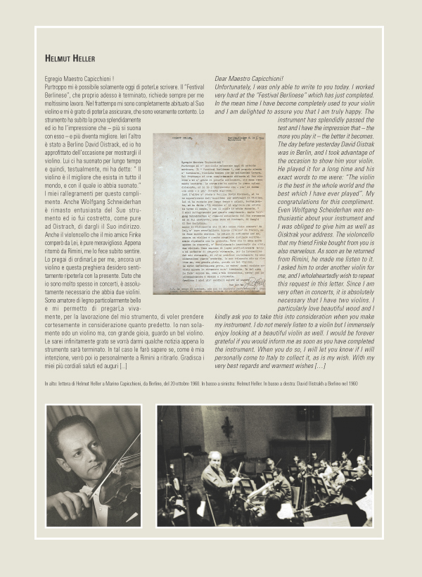 In my research, I discovered with pleasure, and at times with amazement, that the special client of Capicchioni were none other than the same artist who initially aroused my passion for music and for the violin: Felix Ayo, Pina Carmirelli, I Musici di Roma, Salvatore Accardo, Yehudi Menuhin, David Oistrakh, Piero Toso, the Trio di Trieste, and the Quartetto Italiano.